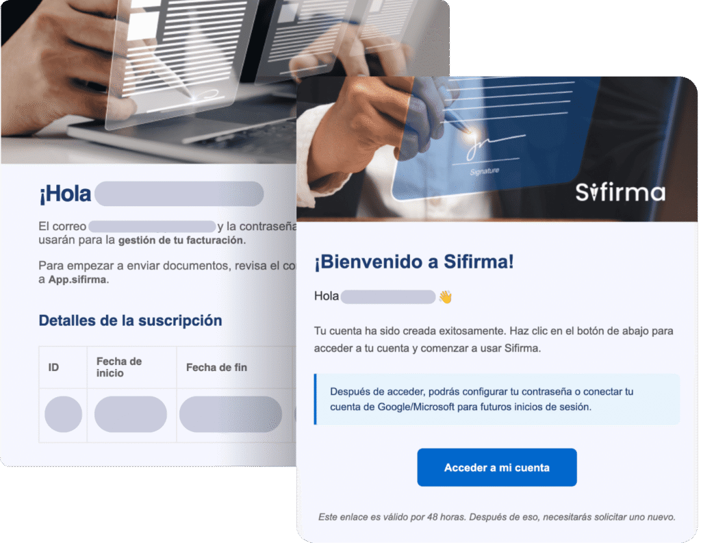 Recibirás dos mensajes: uno con los detalles de tu suscripción y facturación, y otro para activar tu cuenta en app.sifirma.